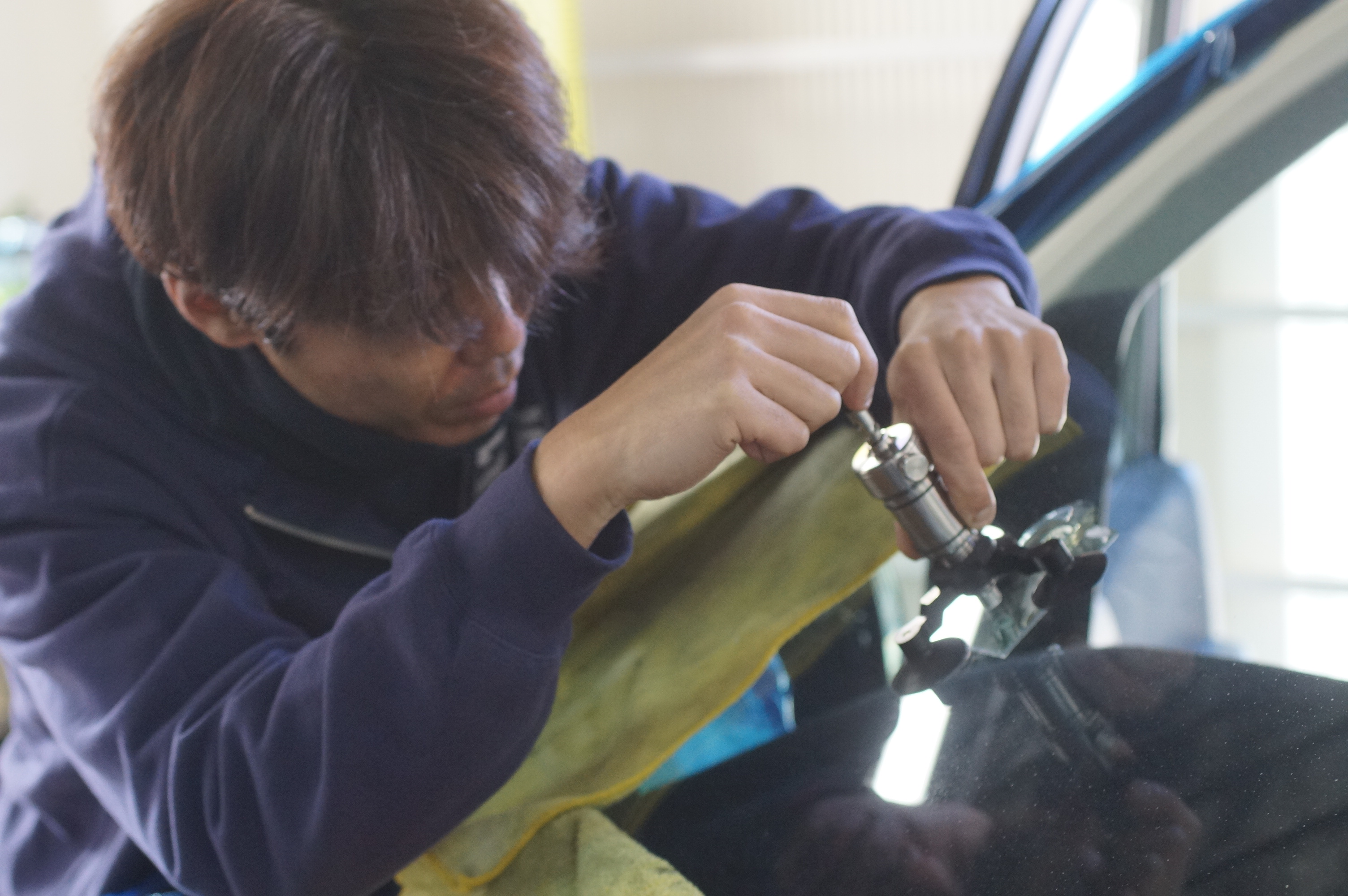 フロントガラスにできた飛び石などによるヒビ割れを専用ツールで丁寧に修復(リペア)いたします。